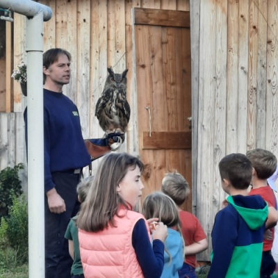Am Ziel angekommen besuchten wir Familie Kraus. Dort waren wir zur Brotzeit eingeladen. Nach einer tollen Stärkung mit Würstchen, Kuchen und Getränken kam der Höhepunkt des Tages: der Uhu Hugo, den Robert Kraus bei sich zu Hause hält. Natürlich erfuhren wir auch viel Wissenswertes über das Tier und wie es in freier Natur lebt. Auch die Wachteln und Tauben faszinierten die Kinder sehr. Am Ende des Nachmittags trennten sich auch viele nur schweren Herzens.