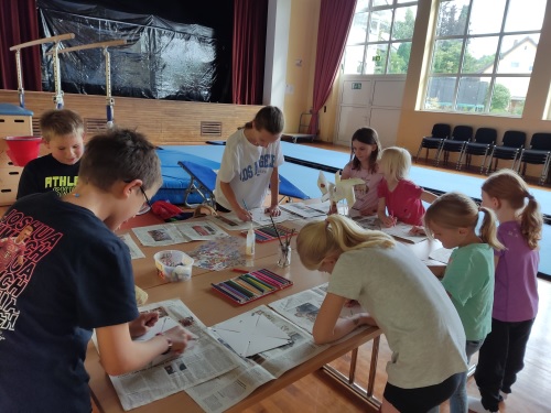 Nach der Begrüßung durch Roswitha Rödl, die den ganzen Nachmittag von Amelie Müller unterstützt wurde, wärmten sich die Kinder erst einmal mit Bodypercussion auf. Hier wird mit dem eigenen Körper durch Klatschen und Stampfen auf coole Sounds Musik gemacht oder begleitet. Bei den Jüngsten ging es dann weiter mit dem Tanz „Alle Kinder haben Träume“ und die Grundschulkinder tanzten den „Körperteile Blues“. Beide Gruppen bastelten in der Pause bunte Windräder, die sie selbst gestalten konnten.
