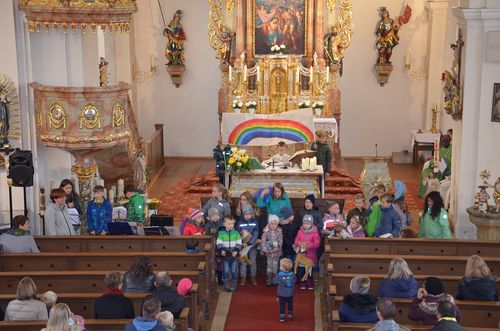 Ganz viele Kinder waren im Oktober eifrig am üben. Am Sonntag, 28.10.18, fand dann in der Pfarrkirche Großkonreuth ein „Gottesdienst für Groß und Klein“ zum Thema „Schöpfung“ statt. Im Mittelpunkt der Messe stand die Geschichte von „Noah unterm Regenbogen“. An Stelle der Predigt wurde ein Theater dazu aufgeführt. Mit Liedern wie „Noah hat das Boot gebaut“ oder „Kommt geschwind“ wurde das Spiel musikalisch umrahmt. Der gesamte Gottesdienst wurde mitgestaltet von den Kindern der OWV Waldindianer, der Musikgruppe Fantastico und ihren Freunden. Kyrierufe, Fürbitten und auch eine Abschlußmeditation waren zum Thema vorbereitet. Am Ende bedankten sich die Besucher mit großem Applaus. Als Andenken durften alle Kinder einen Würfel-Bastelbogen mit Noah-Motiven mit nach Hause nehmen.